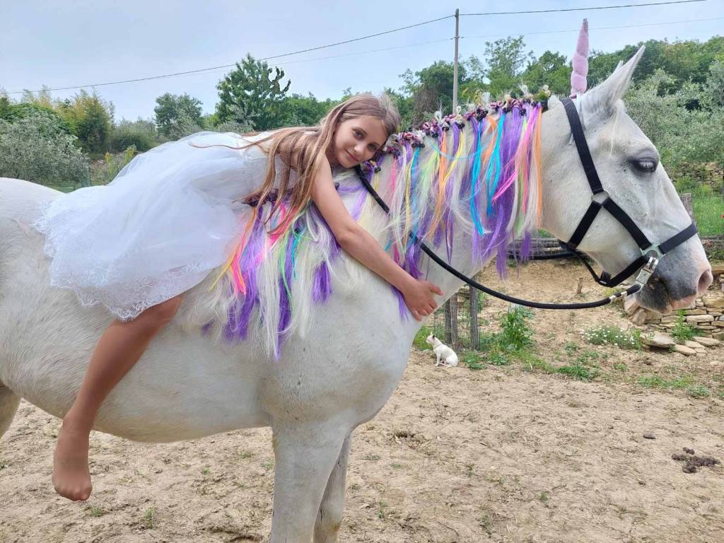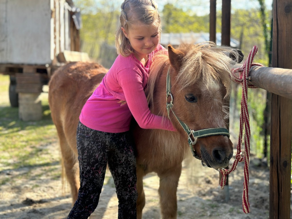 Naši štirje konji so zelo mirni in primerni za jahanje otrok. Šetlandska konja (ponija), Prishila in njena nona Anabel, sta zelo primerna za jahanje najmlajših otrok, od tretjega leta dalje.