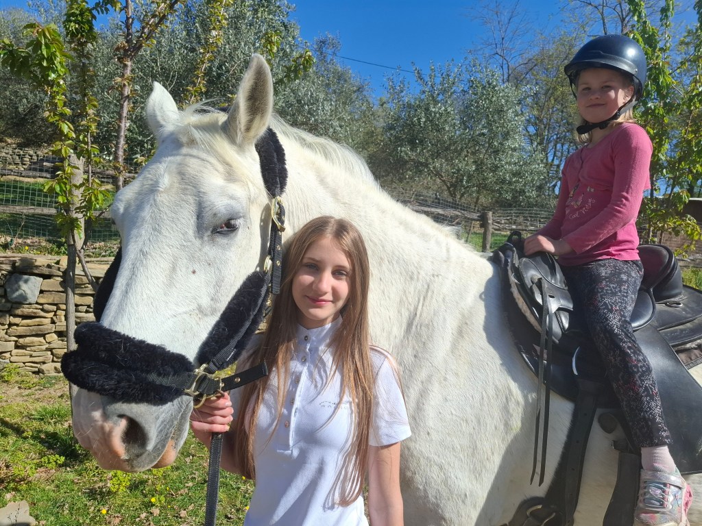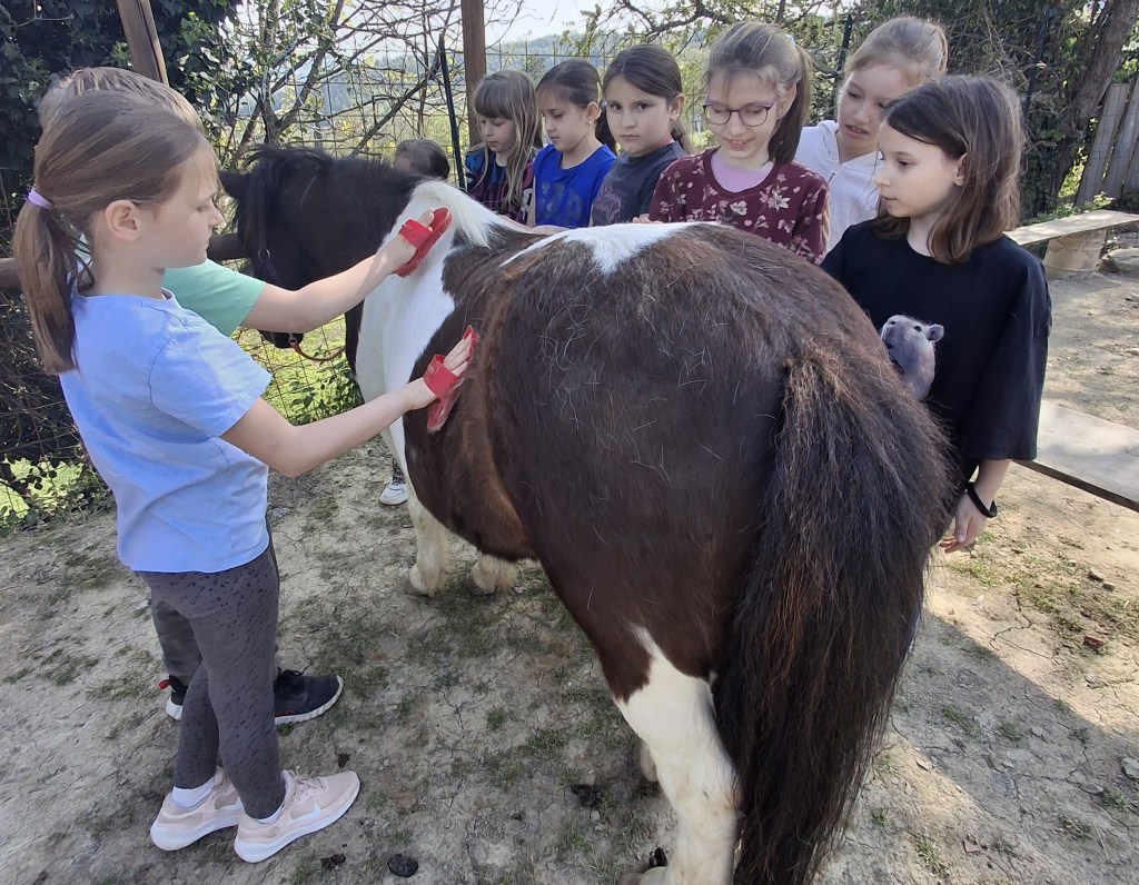 Priprava in nega (česanje, krtačenje) konj in osličkov ter jahanje.